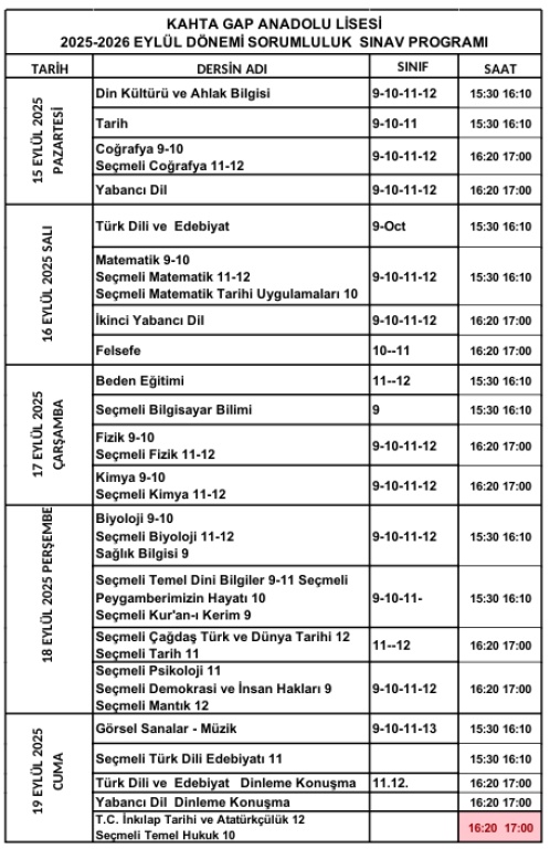 Kahta GAP Anadolu Lisesi 2025 - 2026 Eğitim Öğretim Yılı Eylül Dönemi Sorumluluk Sınav Takvimi
